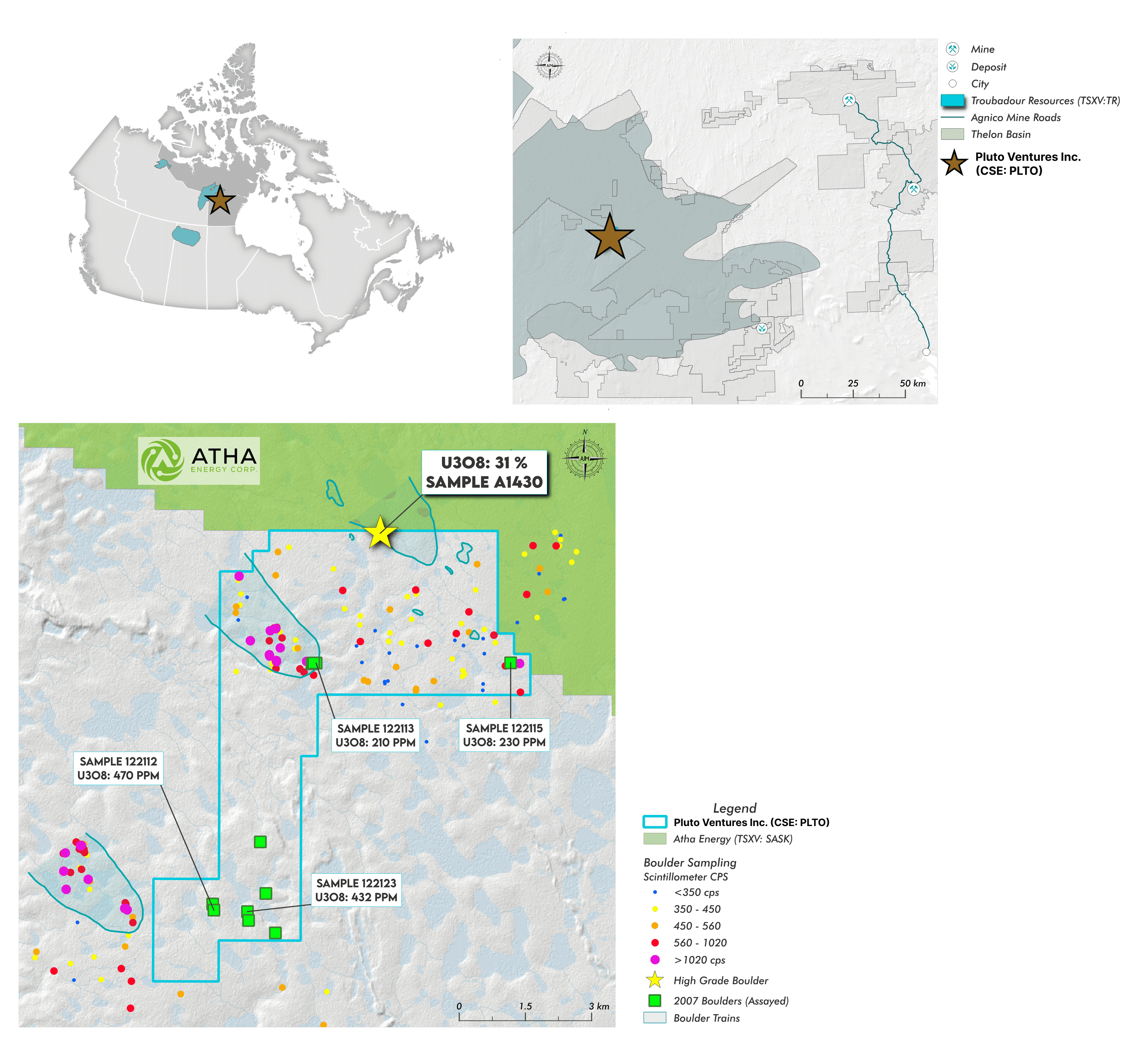 Historical exploration identified multiple uranium-bearing boulders, including a standout sample grading 31% U₃O₈, indicating proximity to a high-grade bedrock source.